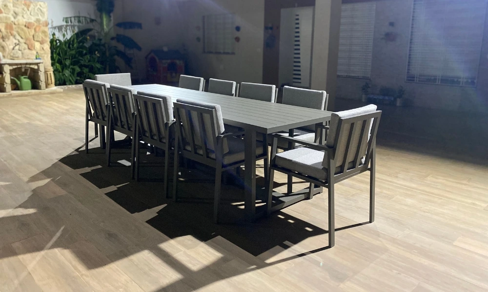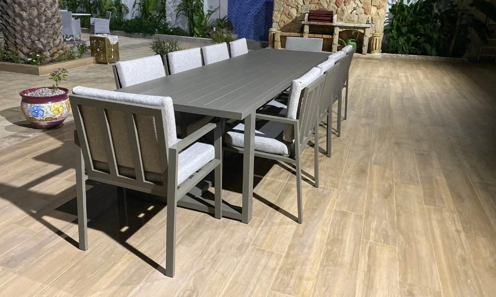 Salle à manger 10 places – Élégance et convivialité Invitez le confort et le raffinement dans votre espace avec notre salle à manger 10 places. Conçue pour accueillir famille et amis dans une ambiance chaleureuse, elle allie structure robuste en aluminium à un design contemporain. Parfaite pour les grands repas en extérieur ou sous pergola, elle résiste aux intempéries tout en offrant un confort optimal grâce à ses assises spacieuses et son plateau généreux.