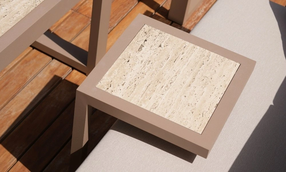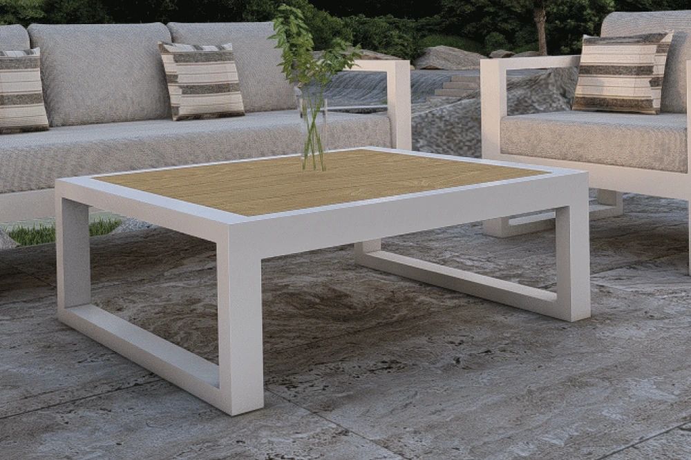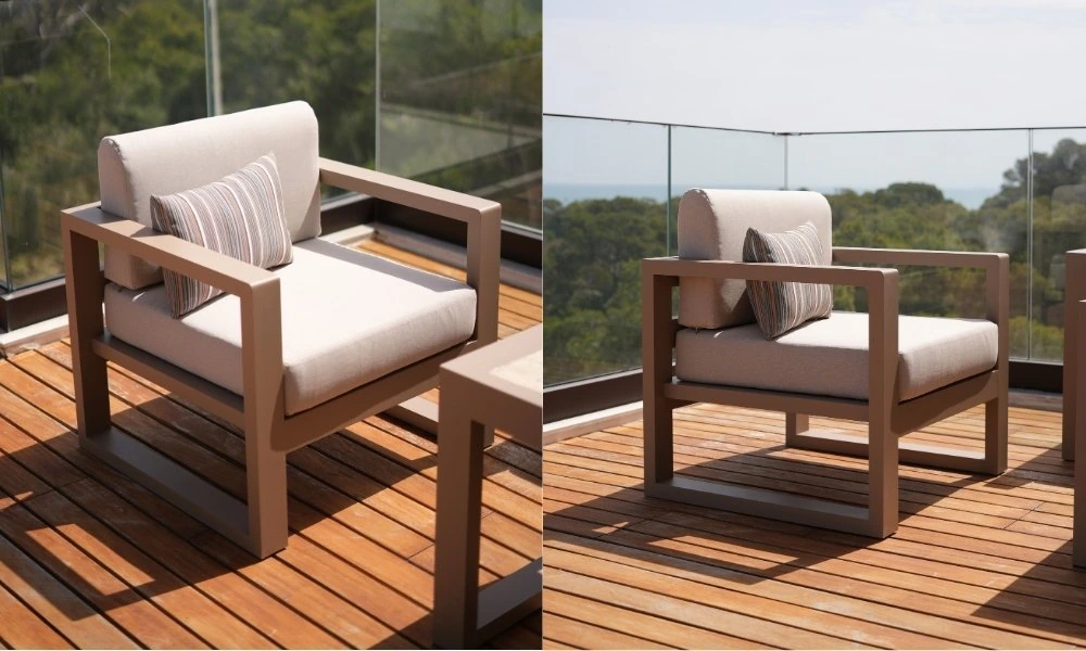 Toutes les pièces du salon de jardin "marseille" s'inscrivent dans une même tendance géométrique. Les fauteuils et le canapé disposent d'accoudoirs en carrés creux, résolument contemporains. Le bois freine / acajou au dessus des accoudoirs est repris sur le plateau de la table basse pour un rendu chaleureux.